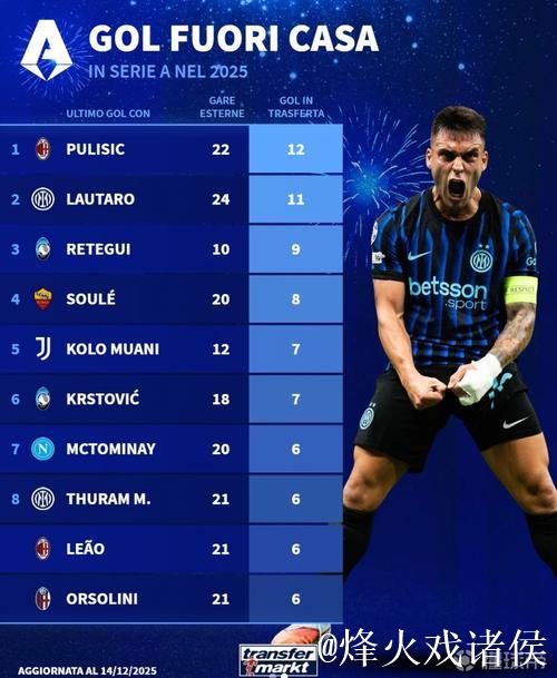 意甲球员2025年客场进球榜:普利希奇12球第1,劳塔罗11球第2